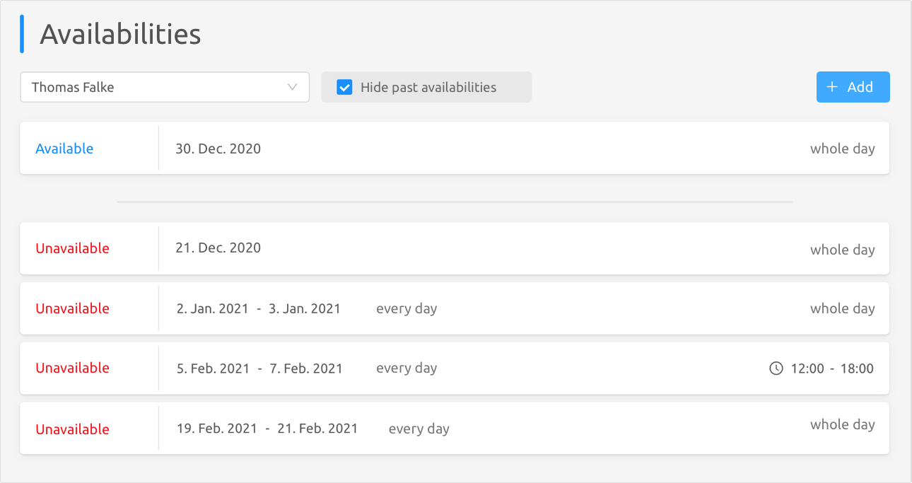 Via the desktop you can access and manage availabilities in the form of a list. Create availabilities or let employees create their own availabilities via smartphone app.